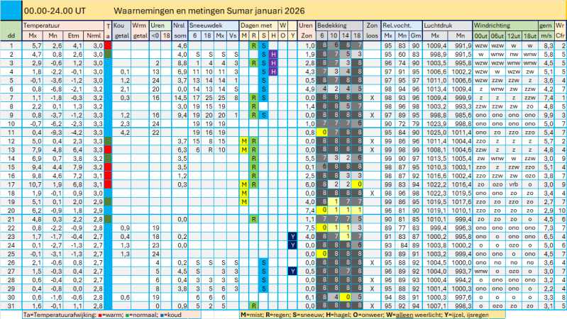 Bijgewerkt tot en met 5 februari 2026: Gemiddelde temperatuur 0,8 °C ■ Neerslag 87 mm ■ Zonneschijn 75 uur.