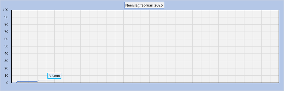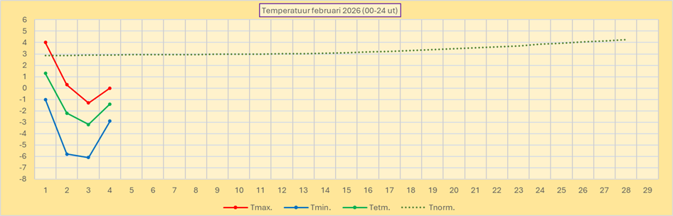 Bijgewerkt tot en met 5 februari 2026: Gemiddelde temperatuur 0,8 °C ■ Neerslag 87 mm ■ Zonneschijn 75 uur.