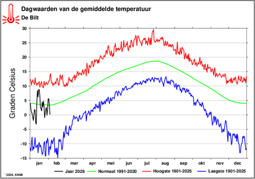 Bijgewerkt tot en met 5 februari 2026: Gemiddelde temperatuur 0,8 °C ■ Neerslag 87 mm ■ Zonneschijn 75 uur.