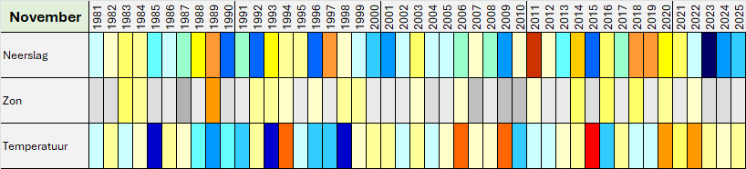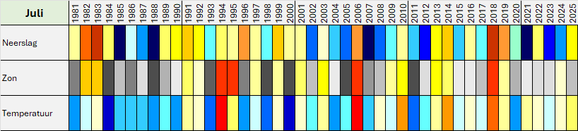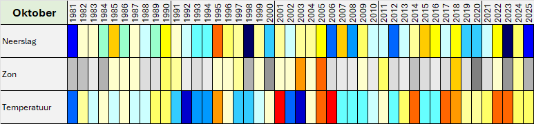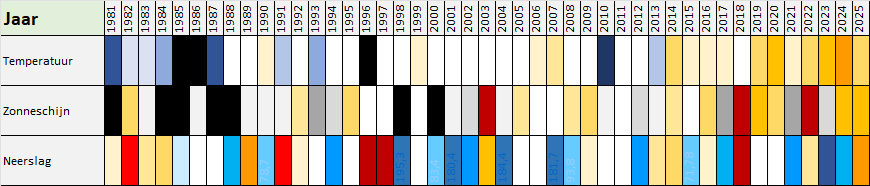 Afwijkingen Temperatuur Neerslag en Zon van 1981 t/m 2025