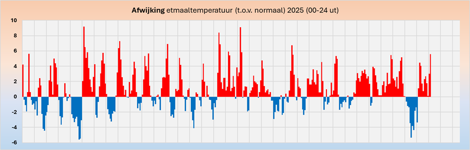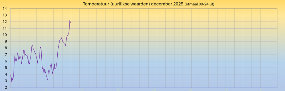 Bijgewerkt tot en met 7 december 2025: Gemiddelde temperatuur 11,4 °C ■ Neerslag 676 mm ■ Zonneschijn 1719 uur.
